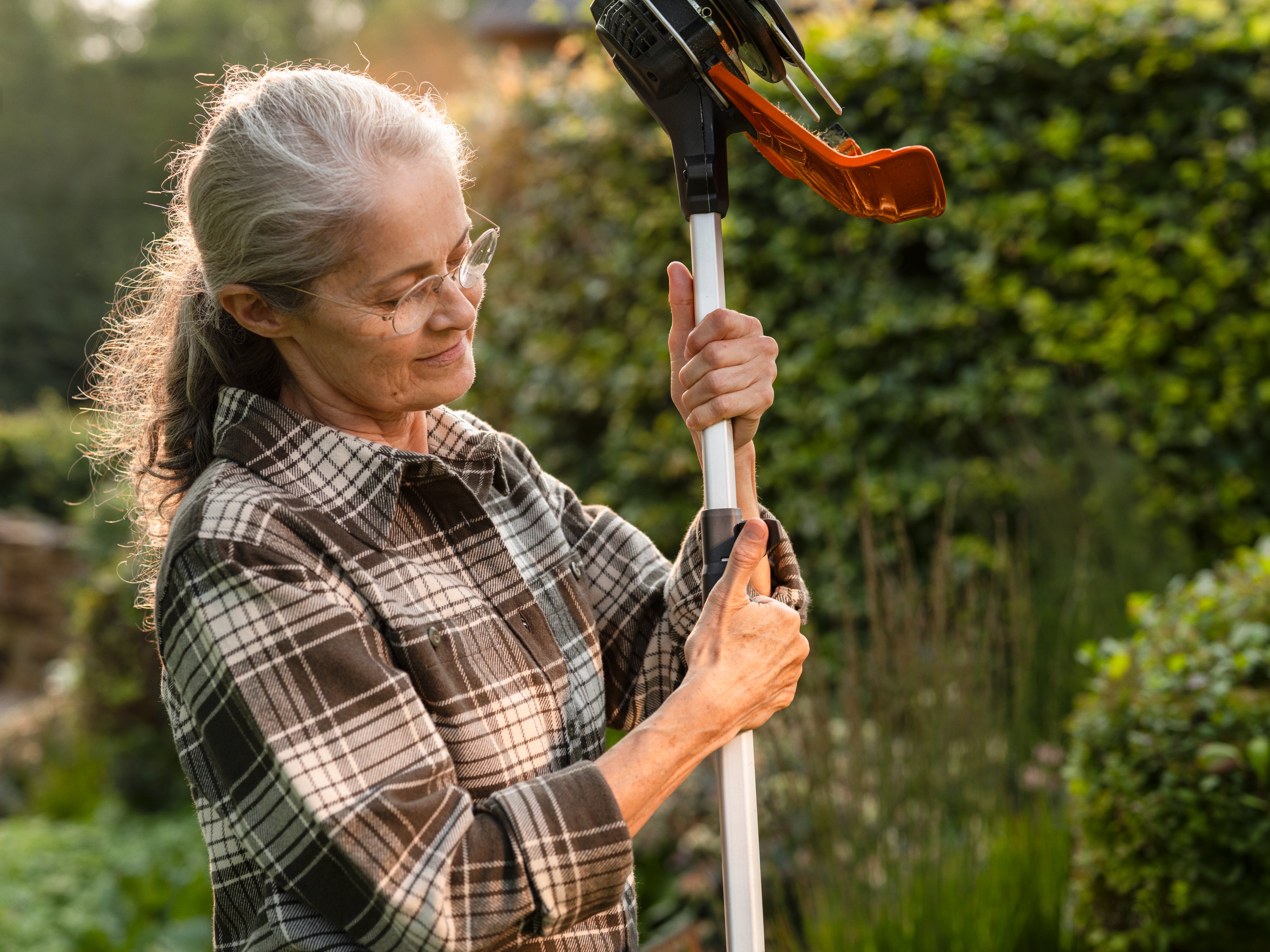 Med teleskopskaftet och det hopfällbara, vinklade röjstyret kan trimmerns storlek minskas med upp till 70 % för enkel förvaring och transport. Det smarta snabbfästet gör det snabbt och enkelt att fälla ihop och justera handtaget.