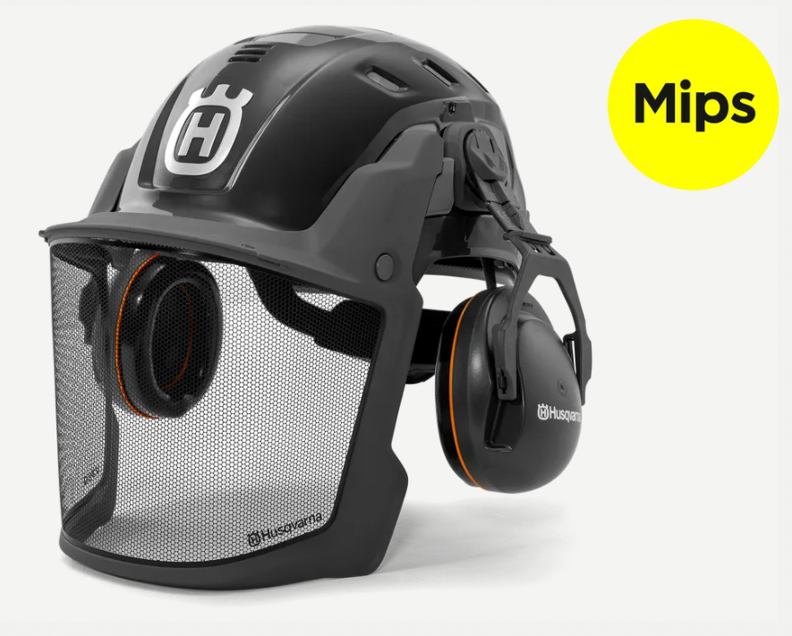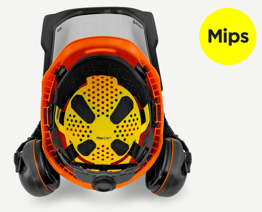 Husqvarnas Technical-hjälm är utrustad med Mips®-säkerhetssystem för skogshjälmar. Mips-systemet är utformat för att ge rörelse inuti hjälmen och hjälpa till att leda om rotationsrörelsen bort från huvudet vid vinklade islag.