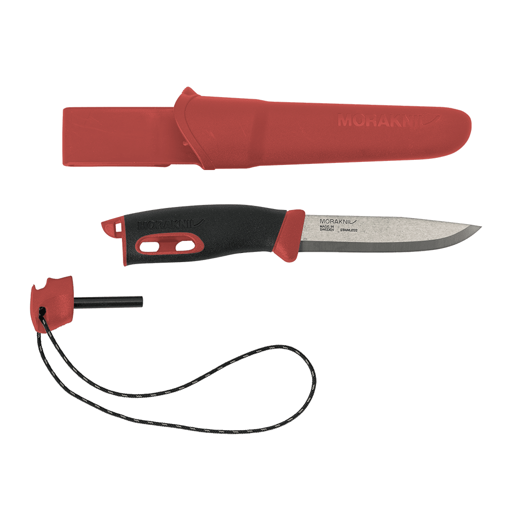 Knivslidan i polymer har ett praktiskt bältesclip så att kniven kan fästas på ryggsäcken eller i bältet. Companion Spark är dessutom utrustad med reflexparacord på tändstålet som minskar risken att förlägga tändstålet i mörker.