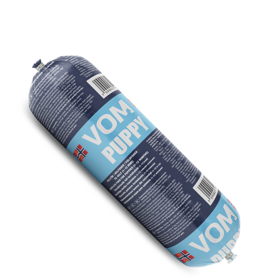 Vom og Hundemat har utvecklat en produkt till valpar som består av kyckling, nötvom, lax, ägg och nötlever. Mixen ger valpen rikligt med nödvändiga näringsämnen och tar särskild hänsyn till valpens protein och energibehov.