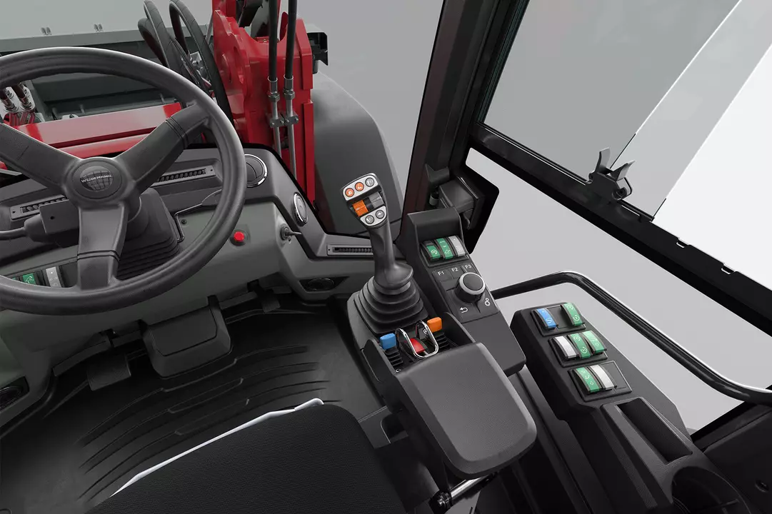 Lyftarmsdämpningen kan aktiveras elektriskt och möjliggör optimal hantering av maskinen i ojämn terräng och vid vägkörning. Det rekommenderas i synnerhet när maskinen transporterar tunga laster i skopan eller på pallgafflarna, eller flyttar ett tungt påbyggnadsredskap över långa avstånd i hög hastighet. Lyftarmsdämpningen sörjer här för en avsevärt högre komfort för föraren.
